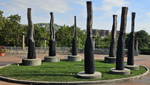 | The alignment ring of seven sculptures indicates the time of solar noon and date of the solstices and equinoxes. The sculpture is titled “Seven Vessels Ascending/Descending”. The alignment of the seven sculptures is on a 40 feet (12m) circle of grass surrounded by a circular red brick plaza.. In the very center of the circles is a 2-foot (.6m) diameter marble slab indicating the direction of sunrise/sunset on the solstices and equinoxes. It also indicates the N-S meridian line and time of solar noon on the solstices. |