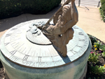 | This is a 5 foot (1.5m) diameter, bronze horizontal dial sitting on a limestone plinth. The dial tells time from V – XII – VII in 15 minute increments. Underneath the style of the gnomon in relief is a sculpture of Hygieia, goddess of health, cleanliness and hygiene. She is emerging from a snake that wraps around the dial face, representing the medical profession. |