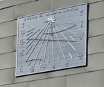 | A stainless steel, vertical south facing dial, declining 15 degrees to the west. The dial is approximately a 6.5 feet (2m) square. Hours are measured VII – XII – V in winter and 8 – 12 – 6 in the summer, telling time in increments of the half-hours. Equinox, summer and winter solstice lines are shown. The gnomon originates from a sun motif with a hole for nodus to indicate the season. |