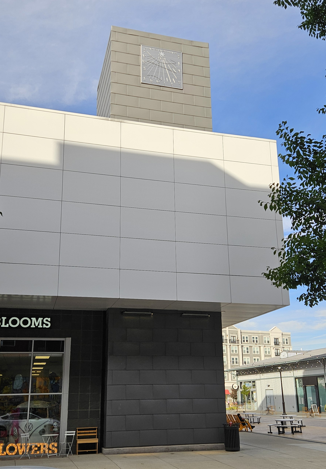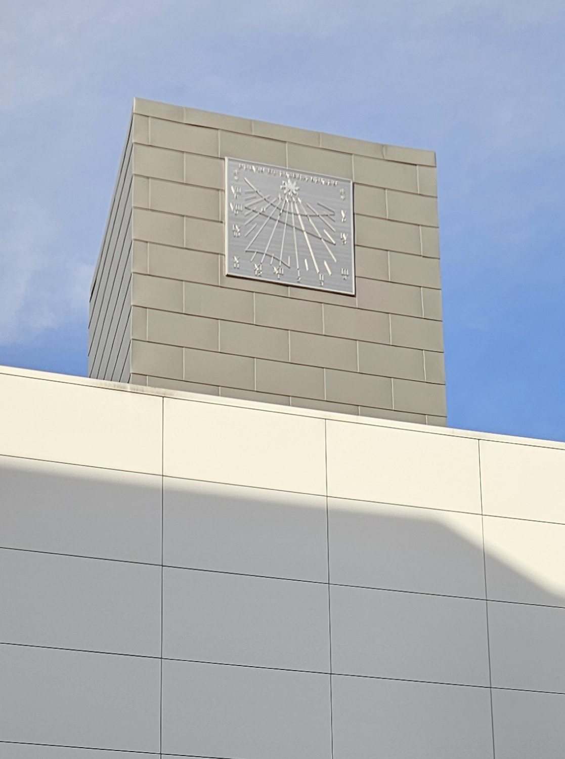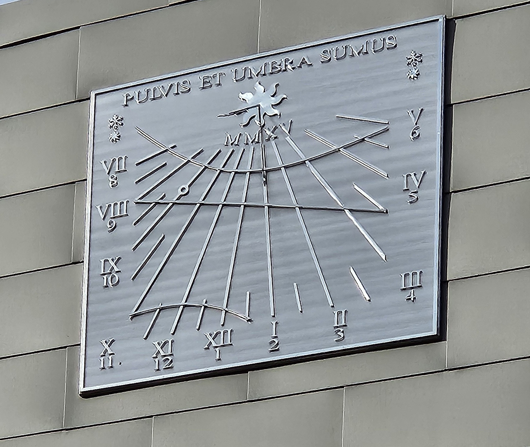 - A stainless steel, vertical south facing dial, declining 15 degrees to the west. The dial is approximately a 6.5 feet (2m) square. Hours are measured VII – XII – V in winter and 8 – 12 – 6 in the summer, telling time in increments of the half-hours. Equinox, summer and winter solstice lines are shown. The gnomon originates from a sun motif with a hole for nodus to indicate the season.