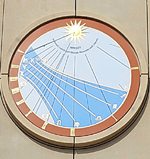 A beautiful 6-ft (2m) circular vertical dial, declining to the south-east. At the circle's circumference are hour numbers from 5am to 1pm. Background is white and within the solstice boarders, painted azure blue, showing the time limits from 4:30am to1:30pm. The gnomon is a thin wire rod with a spherical nodus. The dial has white declination lines for the months, marked with the signs of the zodiac.