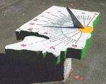 A simple horizontal dial marked with solar hours, unusual in having a reflective chrome coating of the entire dial (in some spots the chrome has flaked off where the underlying material has started to rust). The gnomon is a triangular vane with a pattern of round holes pierced though it. The dial face is approximately 20" (50cm) square and wraps down at the edges to make a 3" (7.5cm) high block. It stands on a square concrete column about 3' (1m) high, which also contains a hidden Time Capsule. |