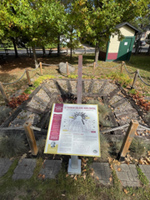 A compound bronze horizontal dial approximately 24in (61cm) in diameter with a second meridian transit gnomon hole to cast a beam of light onto a noon analemma. The outer chapter ring shows Standard Time with Roman numerals, 1 hour marks. The inner chapter ring show Daylight Savings Time in Arabic numerals with 15 minute marks. Note that like most horizontal dials standard/daylight time is local solar time, measuring time as it crosses the meridian. The noon analemma uses holidays and seasons as date marks. The analemma is offset from the dial's N-S meridian, showing the sun's illumination on the analemma curve using local Daylight Savings Time. Fairfield Ohio, even at 84° W is on Eastern Time, such that to tell civil time, one needs to add 38 minutes to shadow time. If one looks at the plaque that contains a graph of the Equation of Time, that 38 minutes is included. Both the offset noon meridian dial and EoT graph result in precise civil time. The whole complex is an octagon about 5 ft (1.5m) across. |