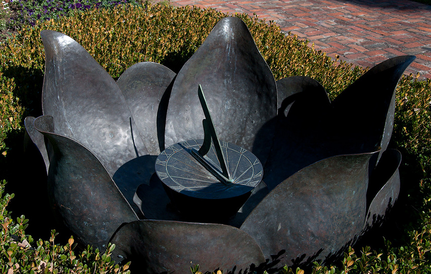 - This bronze horizontal dial is about 14in (356cm) in diameter with simple hour lines radiating from the gnomon foot to the circumference where Roman hour numbers mark the hours from 5am to 7pm The dial stands in the middle of a bronze lotus flower about 80in (2m) in the round.
