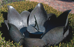The armillary dial is made of red bronze and rests on a quarried stone pedestal. The equatorial ring includes hour lines with 15-minute marks and Roman numerals. It was created by Frank Cheney, a UC Berkeley graduate, Class of 1941, and later donated to the Garden by his family. Mr. Cheney was a civil engineer who developed a hobby of building sundials. |