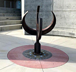 "Sky Gate" is a huge 24 foot (7.3m) undulating sculpture of black metal is known as one of Honolulu's most distinctive pieces of public art. There is a hidden astronomical alignment. On zenith days (~28 May and ~18 July) when the sun is directly overhead at the zenith at the moment of local solar noon, the shadow of the sculpture forms a perfect, large circle on the ground directly below. The zenith day noon is known as "Lāhainā Noon", a term coined by the Bishop Museum, and in Hawaiian means "Cruel Sun". Noguchi, the sculptor, didn't leave a plaque, but Tory Laitila, registrar at the Mayor’s Office of Culture and the Arts, says, "Art is a subjective experience, and artists like to leave things for the viewer to discover." Now the Lāhainā Noon is well known and there is usually a crowd with cameras to document this twice annual event. |