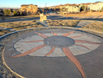 | Analemmatic human sundial, marked with both standard and daylight saving hours (5am-9pm MDT) arranged on an ellipse determined by the latitude.. The whole sundial is 10 ft (3m) in diameter, surrounded by a gravel moat. The zodiac walkway is encompassed in a circular center sun, with months marked in blue. Vertical sandstone stones at the edge mark the cardinal directions. |