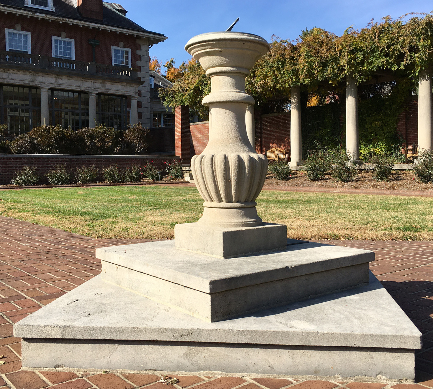 The dial sits on an ornamental stone pillar nearly 40 inches tall, supported by three square platforms of increasing area and height, totaling 18 inches in height altogether.