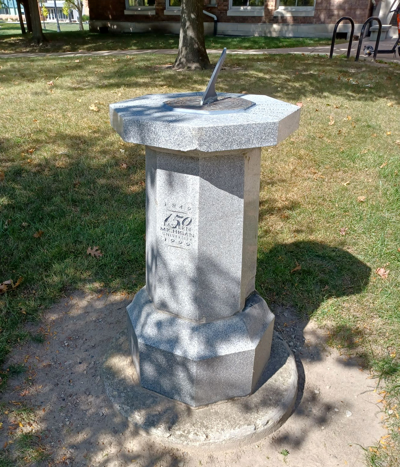 • The original horizontal dial and gnomon of 1909 was cast in iron as a gift from the Class of 1908 (then known as the Michigan State Normal School ). This dial is now in the EMU archives.[See NASS Dial #1086] The current sundial was placed in the same spot in front of Serzer Observatory in the 1960's, but went missing after a broken gnomon was sent for repair, and was lost for 30 years. In 1999, during the sesquicentennial celebration of the university, EMU had the sundial restored by Arnets Becker Burrell Monuments of Ann Arbor. They also had the sesquicentennial logo added to the pedestal. The restoration was funded by the Serzer family. The elegant weathered brass and copper dial is now known as the "Sesquicentennial Sundial". Surrounding the dial are lines in the granite plinth to the cities of Montreal, Detroit, Boston, New York, Whittington DC, Toledo, New Orleans, St. Louis, Chicago, Kalamazoo, Grand Rapids, Lansing, and MT Pleasant. The original Class of 1908 4-ft (1.2m) granite pedestal still holds the sundial, including its mark of "150 years".