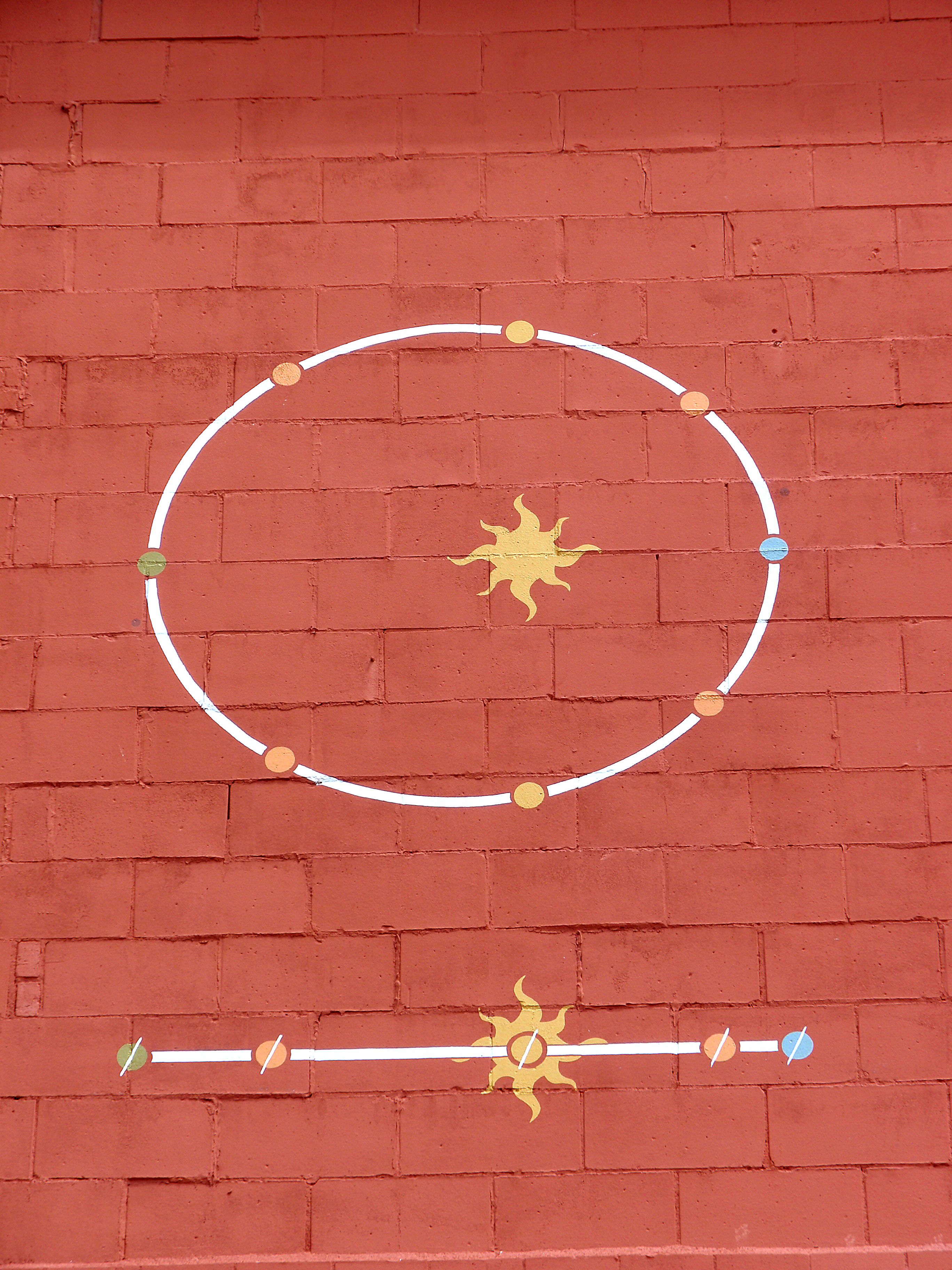 Winter and summer solstice, and the cross-quarter days falling midway between solstices and equinoxes, are shown as lines color-coded to correspond to two graphic illustrations to the left of the dial. One graphic shows the position of the Earth on quarter and cross-quarter days; one represents a side view of the Earth's axial tilt in the orbital plane. The dial was designed as an educational tool to show the dynamic relationship between the Earth and the Sun, and where a person is in the annual cycle when viewing the sundial.