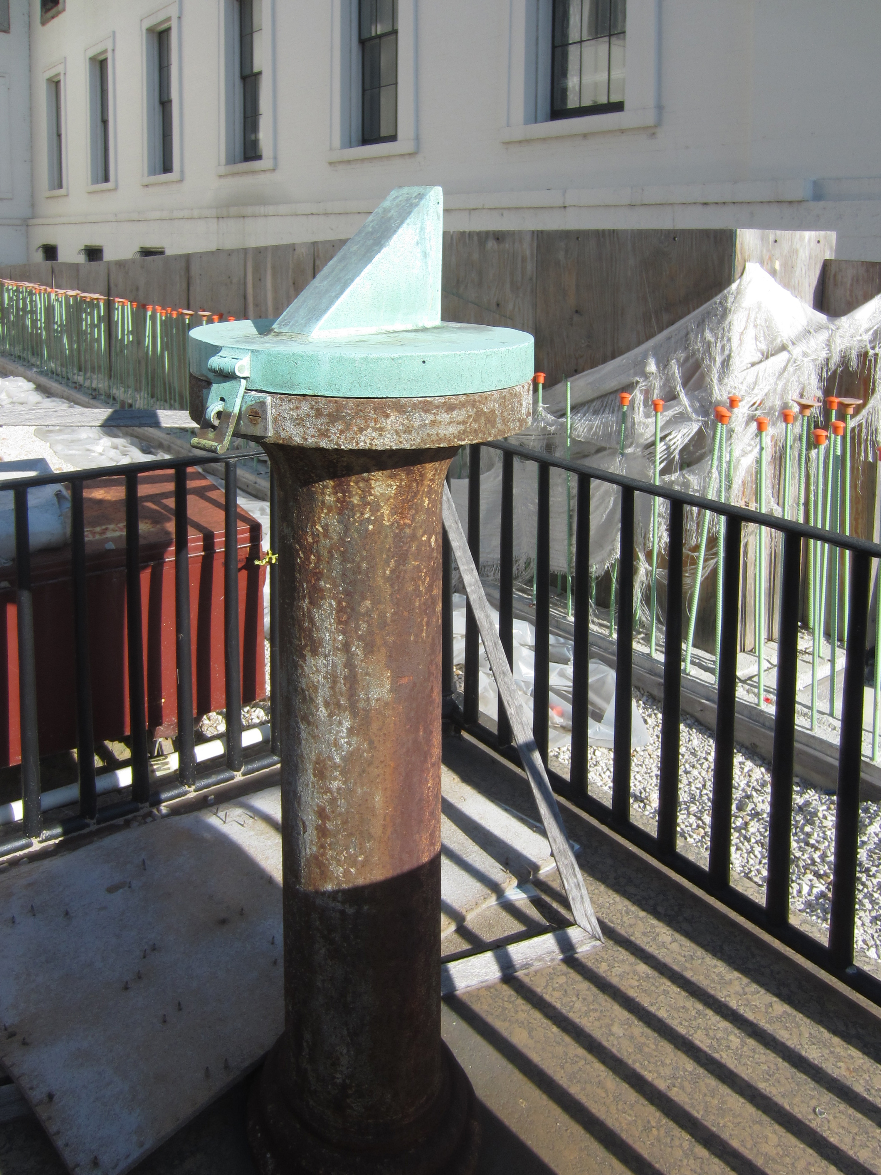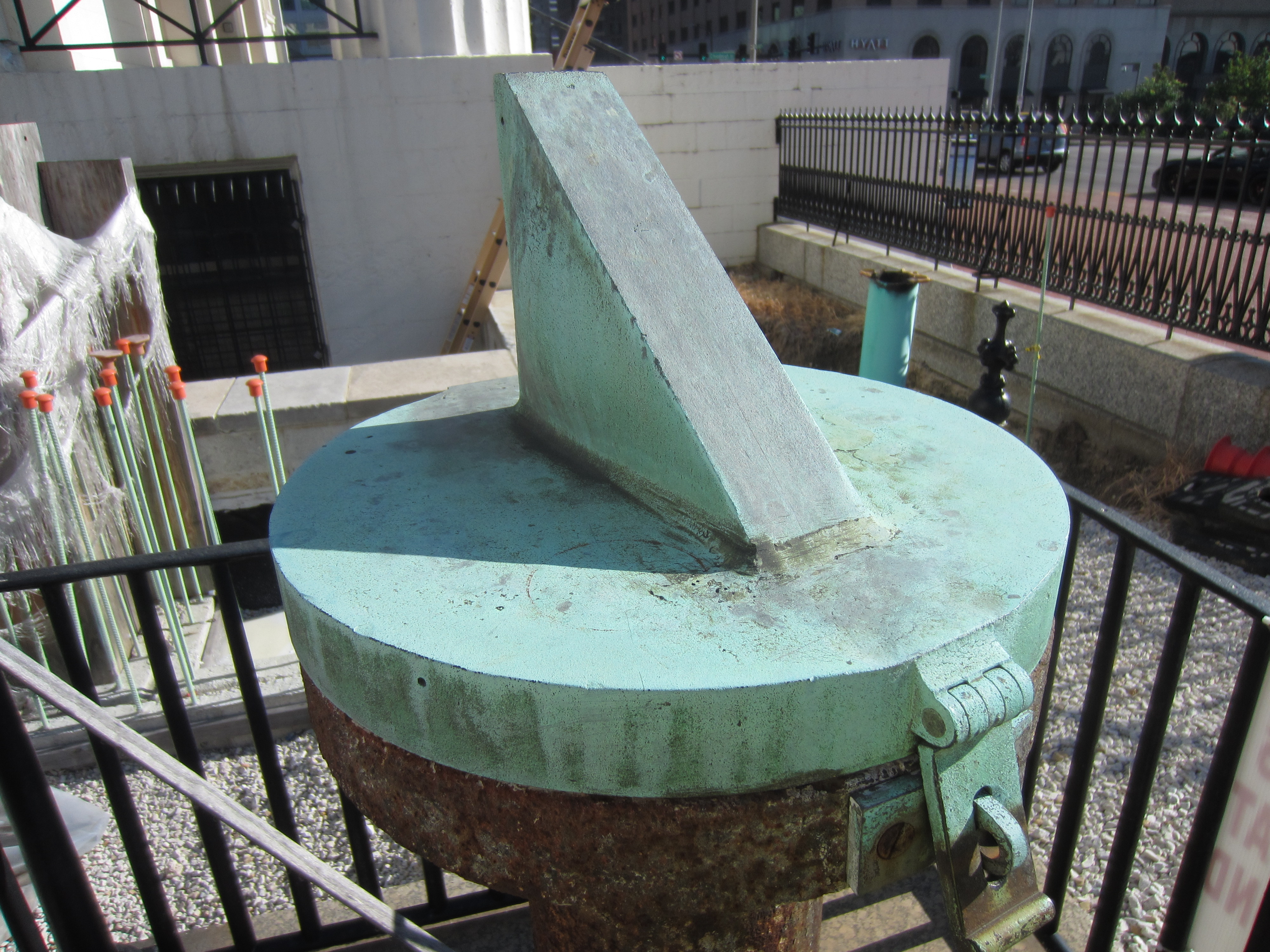 - The circular bronze dial sits on an iron pipe, surrounded by a picket fence and protected from the elements by a brass hood. It is a nearly identical dial to the one at the St. Louis Arsenal (NASS dial #847), and was manufactured in the same year, 1859. It is likely that master armorer N. Engels, machinist A. Schaedel, and engraver W. Hawksley created this dial. The Old Courthouse Dial measures 17 inches in diameter, has a large unadorned triangular gnomon, and on the plate has hour lines from 6am to 6pm delineated every 15 minutes. There is a curious second set of hour lines at the top of the dial plate from 10am to 2pm. Hour numbers are in Roman numerals. There are no other engravings on the dial.