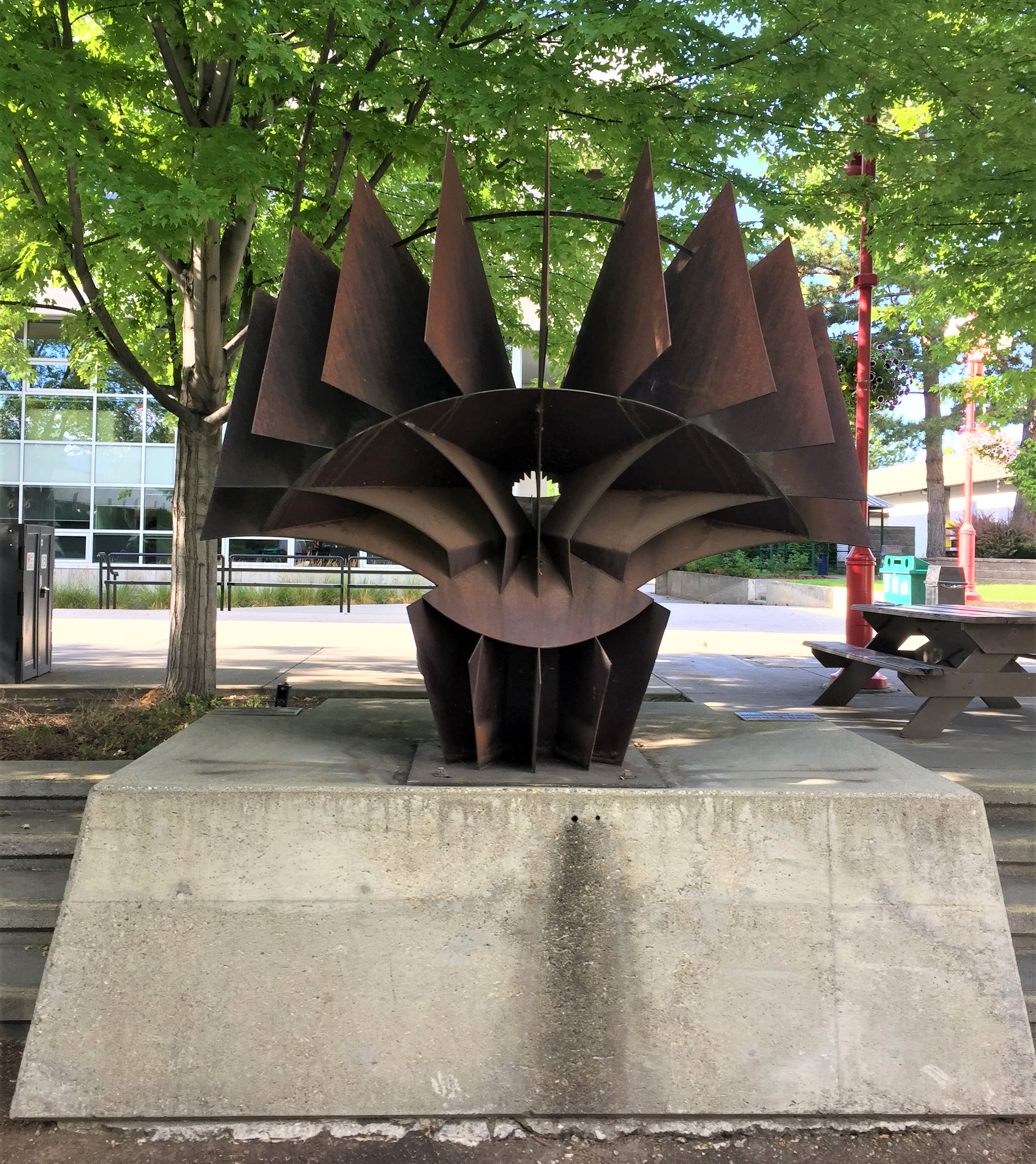 - It is a large sculpture that acts as a shadow plane dial delineated at hourly intervals. The dial is about 3m high. It is made of mild steel with a concrete base, very precisely cut and installed. It shows local solar time, delineated at hourly intervals. Each shadow plane projects onto a small vane that has notches cut out, the number of notches indicating the hour. This dial is one of the earlier artworks by Alan Storey, a successful Canadian sculptor specializing in large-scale public art. The setting is a pleasant tree-lined courtyard at the center of the campus. in the years since the courtyard was laid out and the dial installed, the trees have grown large and cast shade on the dial. The best time to view the dial in sun is probably mid-morning, or in the winter when deciduous trees have lost their leaves.
