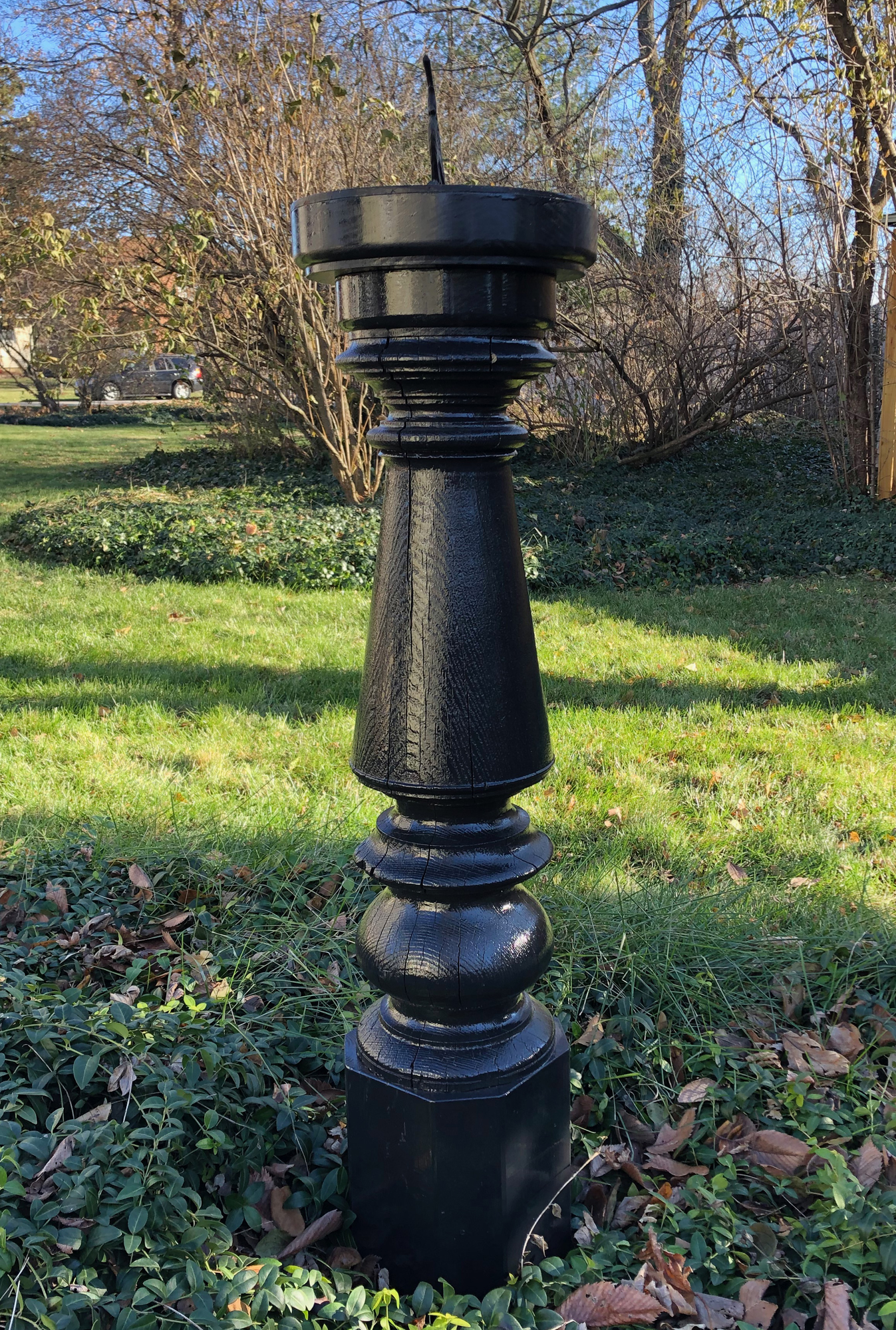 - Classic black cast iron sundial 9.5 inches (24 cm) in diameter. Chapter ring with Roman numerals 5am - 7pm. Delineated with notches every fifteen minutes. Cast iron gnomon with bird interior, painted as brass. No noon gap for the half-inch (1.25 cm) thick gnomon. The original red oak wood pedestal was rebuilt in the summer of 2022. For added durability the pedestal was finished with several coats of Epifanes Yacht Enamel