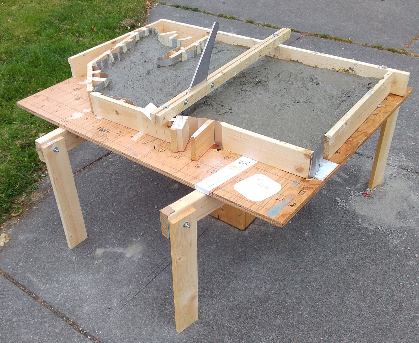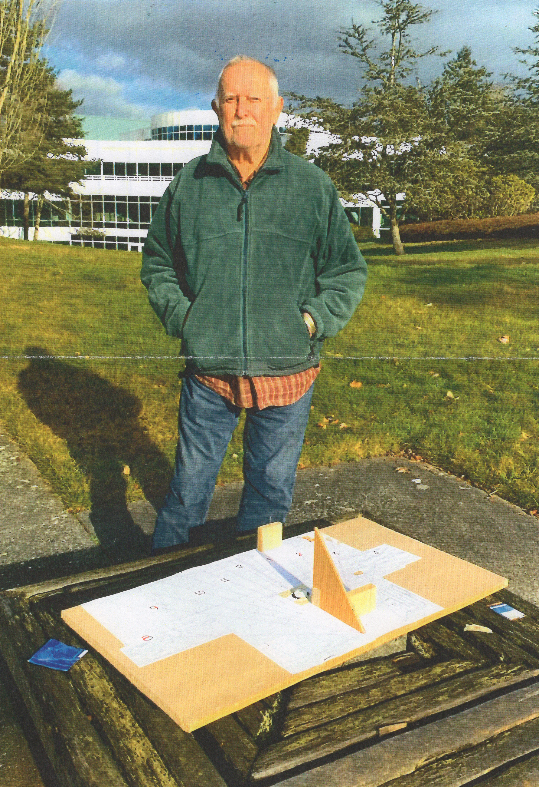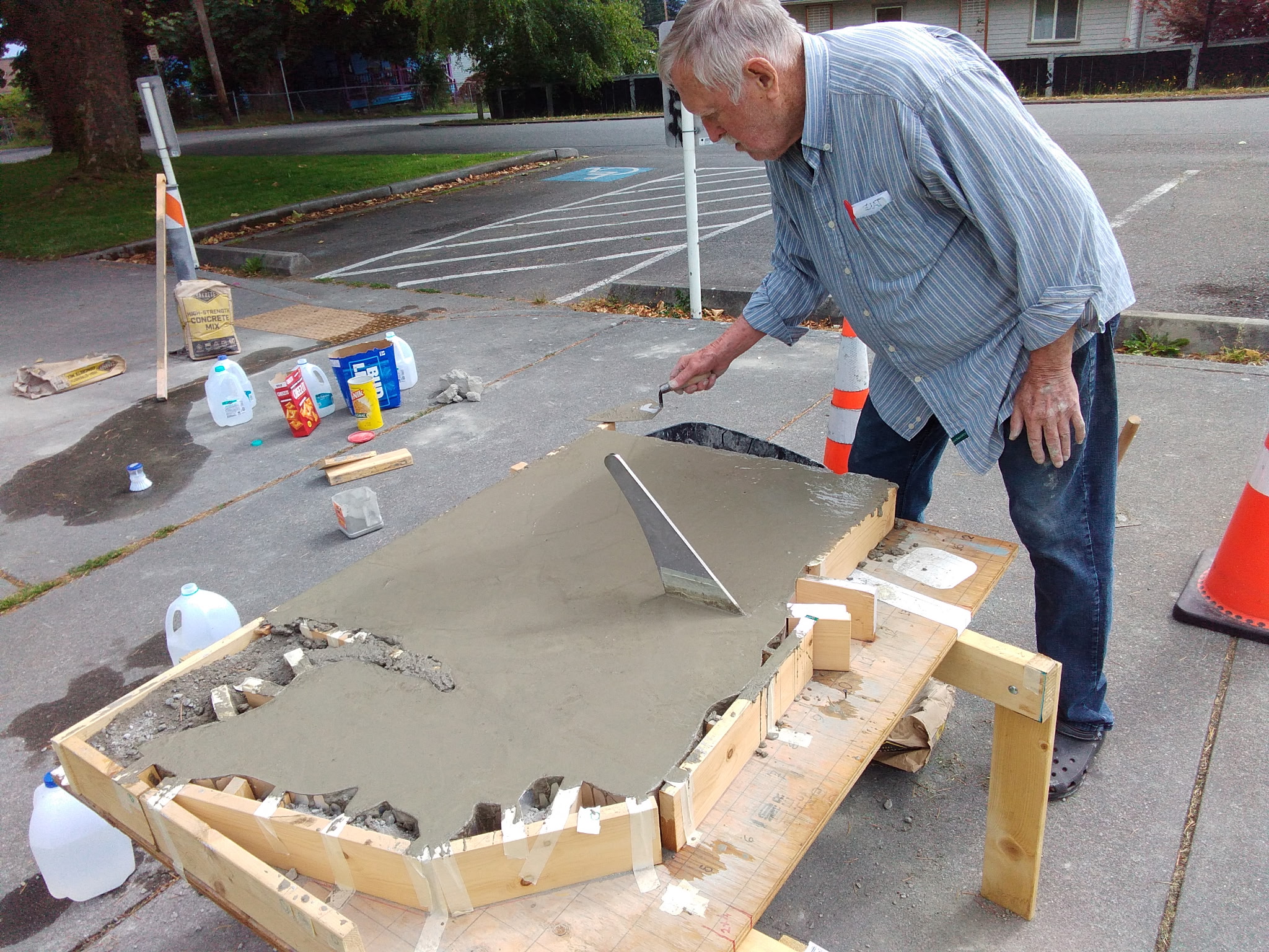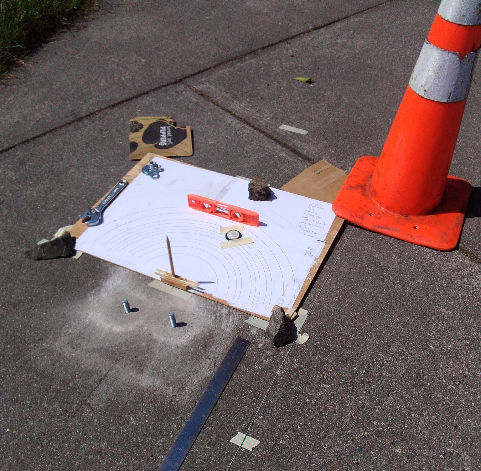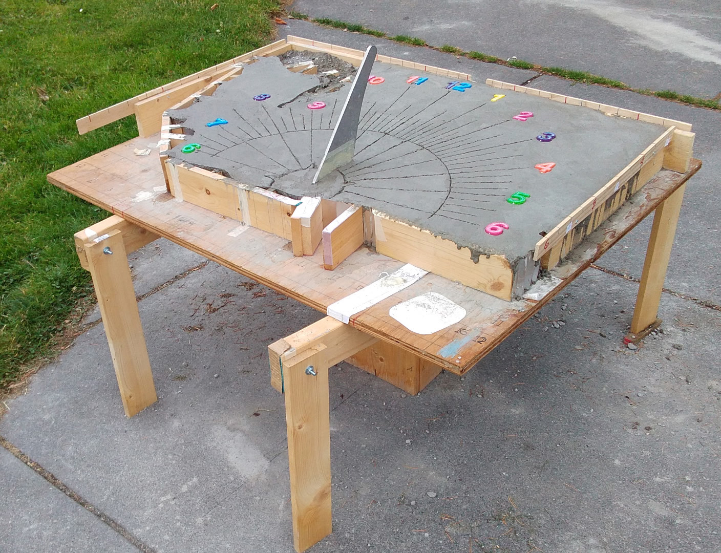 • A concrete dial in the shape of the state of Washington, about 30 x 50 in (76 x 127 cm). Radiating from the stainless-steel gnomon are 48 hour lines, providing time lines every quarter hour from 6am to 6pm. Hours are Arabic numbers at the end of hour lines that vary in length throughout the state. Galvanized and painted black are markers for the cities of Vancouver, Olympia, Tacoma, Seattle, Everett, Bellingham, and Spokane. The dial sits on a concrete pillar 23 in (59 cm) tall.