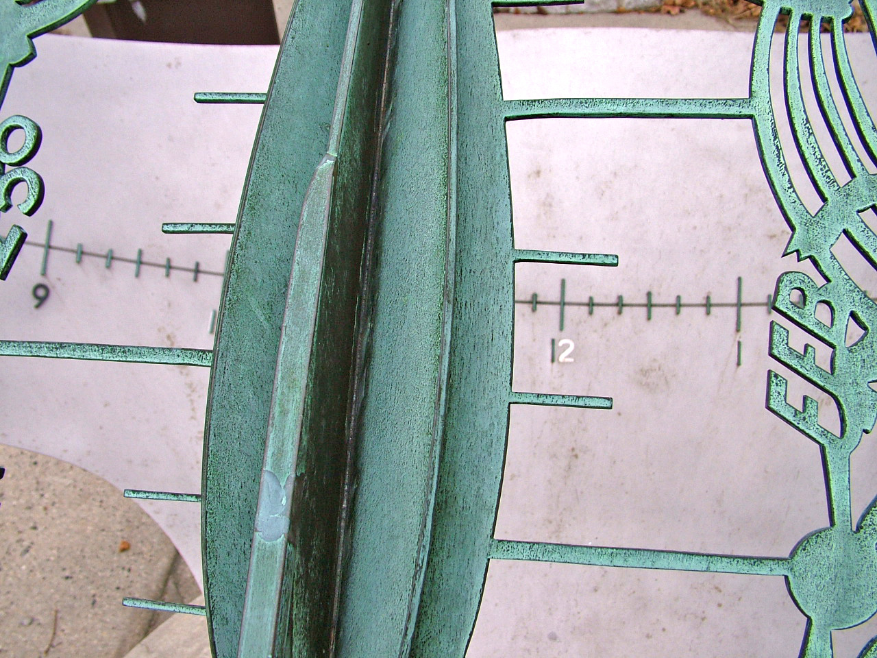 - A modernistic equatorial dial about 6 feet in diameter. The analemma shaped gnomon casts standard time onto a wide metal semicircle band. The hours with 10-minute marks are inscribed on the center of the equatorial band. This unique sundial tells the time, indicates the approximate day of the month and projects the zodiacal constellation signs as they are aligned with the sun and the earth in this era. It is accurate to within two minutes.
