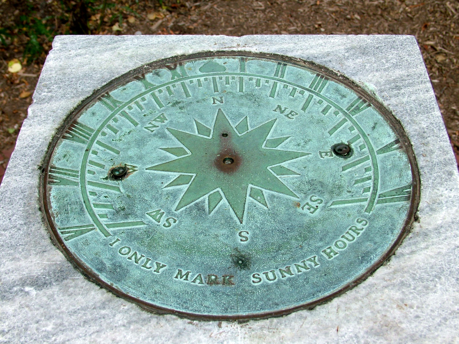 • A 10 inch diameter horizontal dial on a 40 inch tall square marble pedestal with dedication plaque. Gnomon is missing.